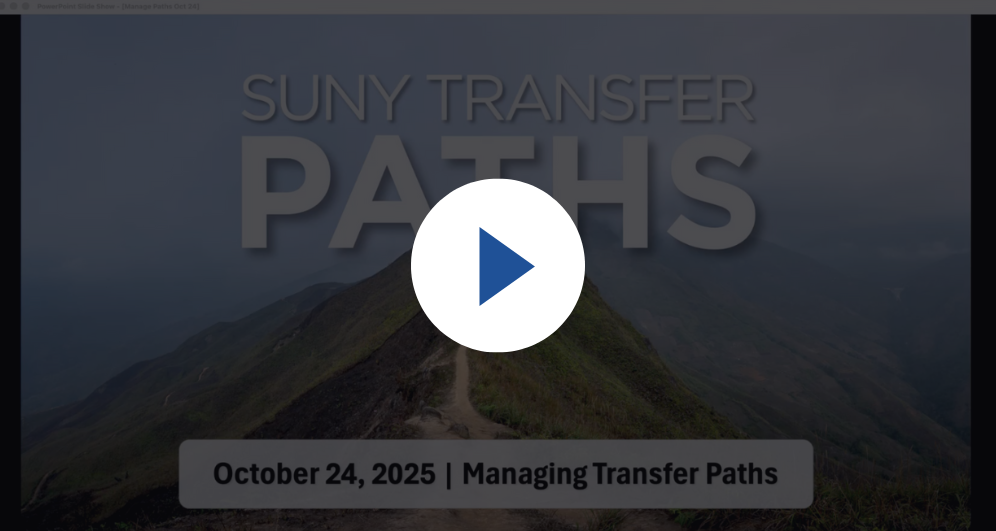 This session is designed to guide and support faculty and staff responsible for maintaining and updating SUNY Transfer Path information on their campuses. It covers best practices, effective strategies, timelines, and expectations for managing core course listings and ways to promote on-campus review.